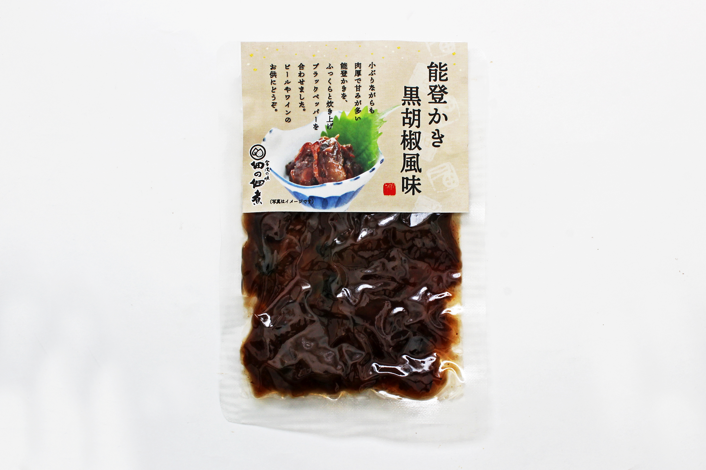 海の恵みたっぷりの石川県産かき貝をふっくらと炊き上げ、香りの良いブラックペッパーをまぶしました。ビールやワインのお供にどうぞ。